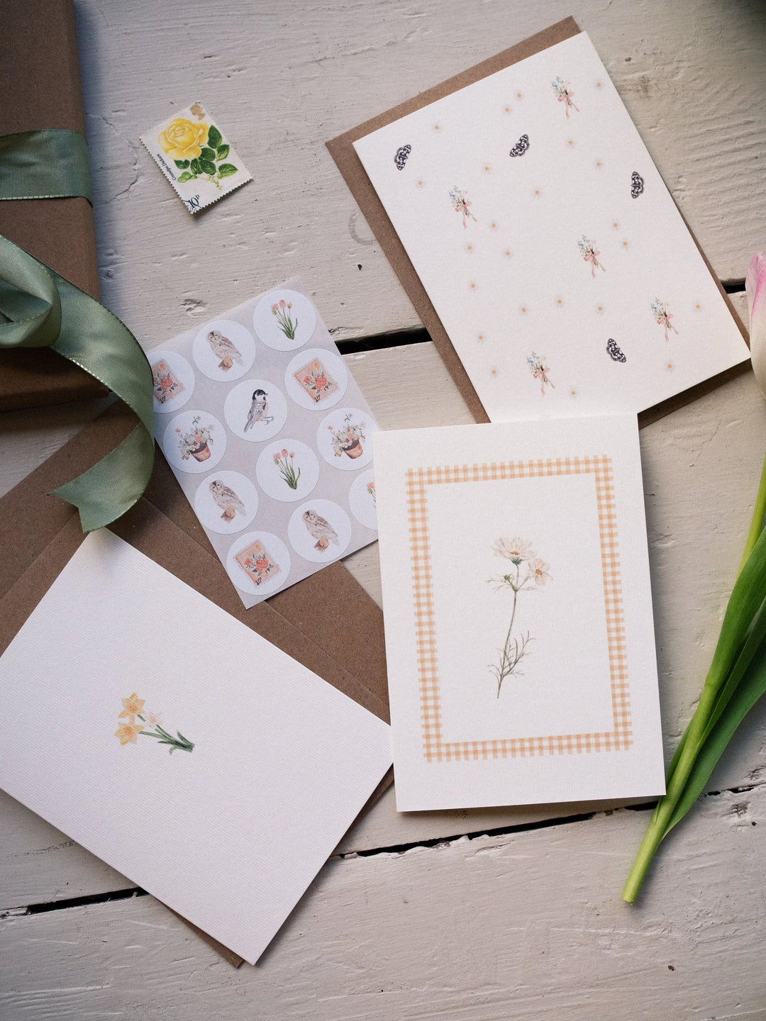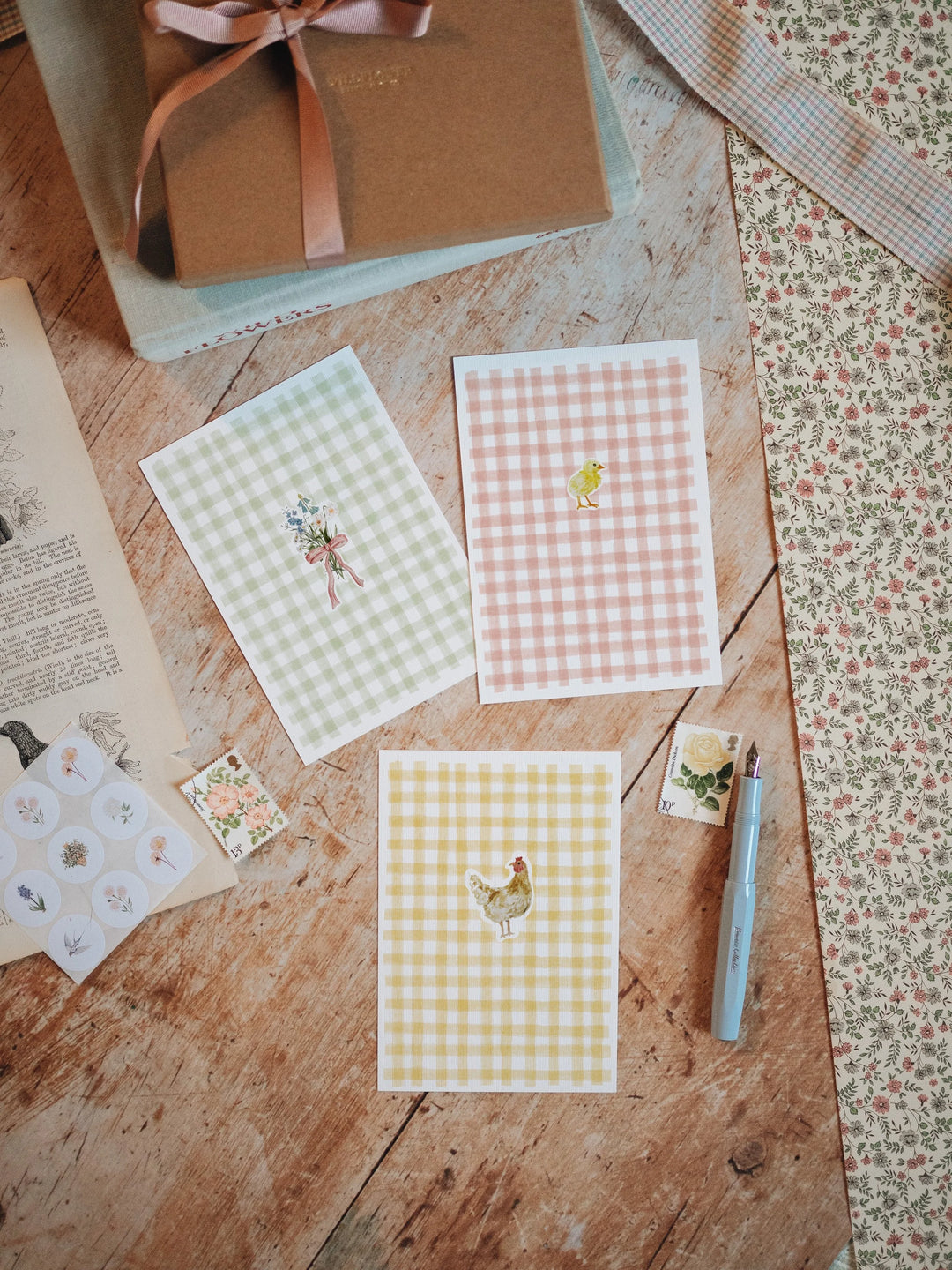 Spring Gingham - Set of 4 hand-wrapped cards with stickers