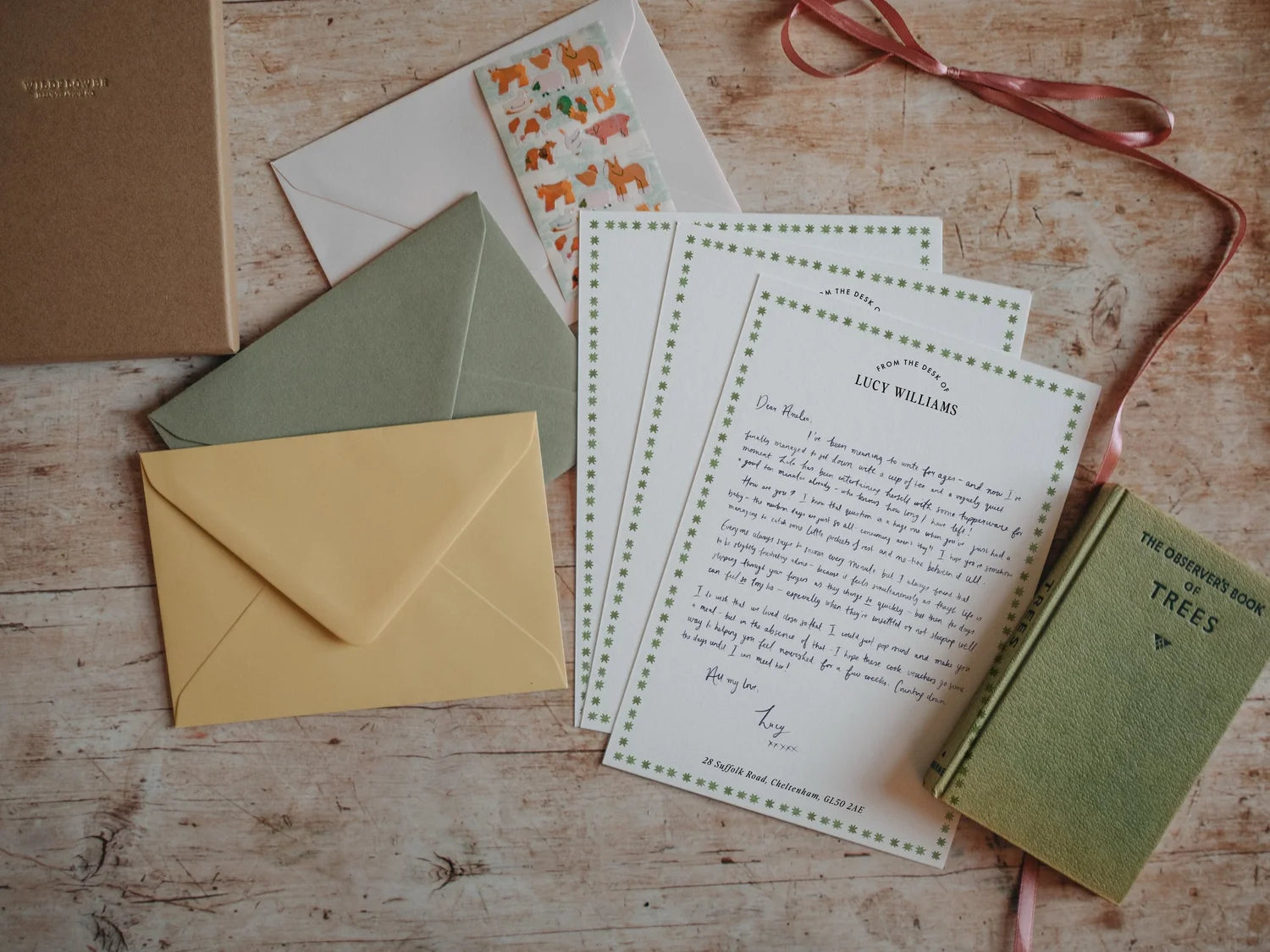 A set of 24 A5 high quality writing sheets printed on luxurious 160gsm lightly textured paper. An envelope is supplied per every two sheets of writing paper, so a total of 12 envelopes accordingly.Other items pictured (pens, stickers, wrapping paper etc. not included)