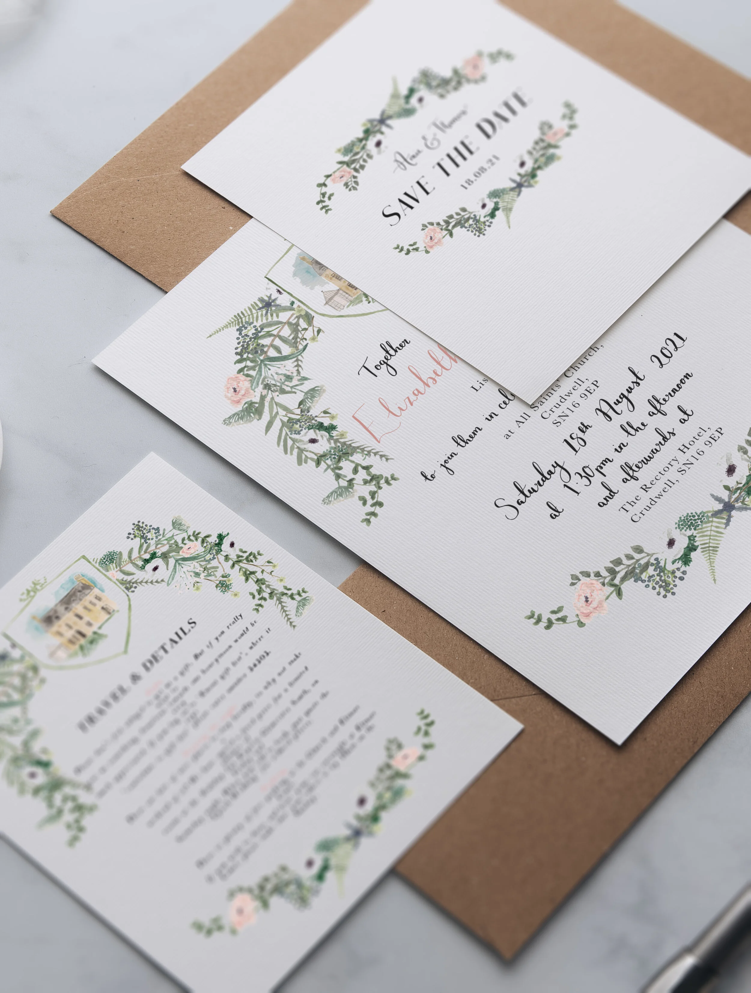 - Info cards - RSVP cards - Illustrated Maps - Schedule of the Day cards - 'belly band' to tie all of the above together -